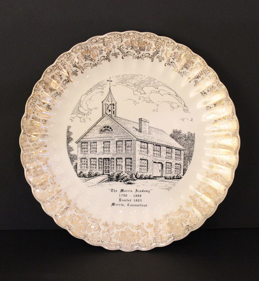 White commemorative plate with scalloped edge. Thick gold, floral and vine border around rim. Center of plate printed in black with an image of a brick schoolhouse. " 'The Morris Academy'/ 1790-1888/ Erected 1803/ Morris, Connecticut" printed in black below image. Printed on back of plate, "MORRIS ACADEMY/ (1790-1888)/ BUILDING ERECTED 1803/ FOUNDED BY, JAMES MORRIS, ESQUIRE/ TOWN NAMED FOR HIM/ MORRIS, CONNECTICUT/ 100TH ANNIVERSARY/ 1859-1959/ NOTED STUDENTS: JOHN BROWN, ABOLITIONIST; (REV)/ SAMUEL J. MILLS, JR., MISSIONARY; (REV.) JOHN/ PIERPONT, POET; CORNELIUS VANDERBILT, FINANCIER;/ SAMUEL MORRIS ENSIGN, PUPIL AND LATER TEACHER WHO/ TOOK OVER AFTER DEATH OF JAMES MORRIS IN 1820./ ALSO: GARY MINOR, M.D., HENRY OBOAKIAH, SANDWITCH/ ISLANDS; RHODA FARNHAM (MRS. JAMES MORRIS, ESQ);/ RHODA SANFORD COWLES, MAJOR GENERAL EDWARD WEED,/ GENERAL MORRIS WOODRUFF, JOHN MASON PECK, ROBERT/ MARCY, M.D., AND OTHER./ ONE OF THE EARLIEST CO-EDUCATIONAL SCHOOLS OF HIGHER/ LEARNING IN AMERICA./ MORRIS WAS FORMERLY SOUTH FARMS, LITCHFIELD, CONN."