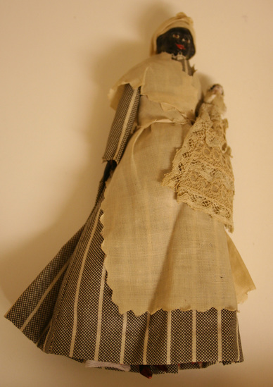 The body of the doll is made of black kid leather, the face is papier mache and the arms and legs are made of wood, carved, painted and tasted to body with red paper. The doll wears a white cotton turban, white cotton petticoat, red wool petticoat, a long grey and white striped dress with bustle under a long white cotton shawl and apron. The black adult doll holds a white baby. The white baby is made of porcelain with a painted face. It wears a long dress made of pieces of lace and sewn to the nurse's arm and apron.