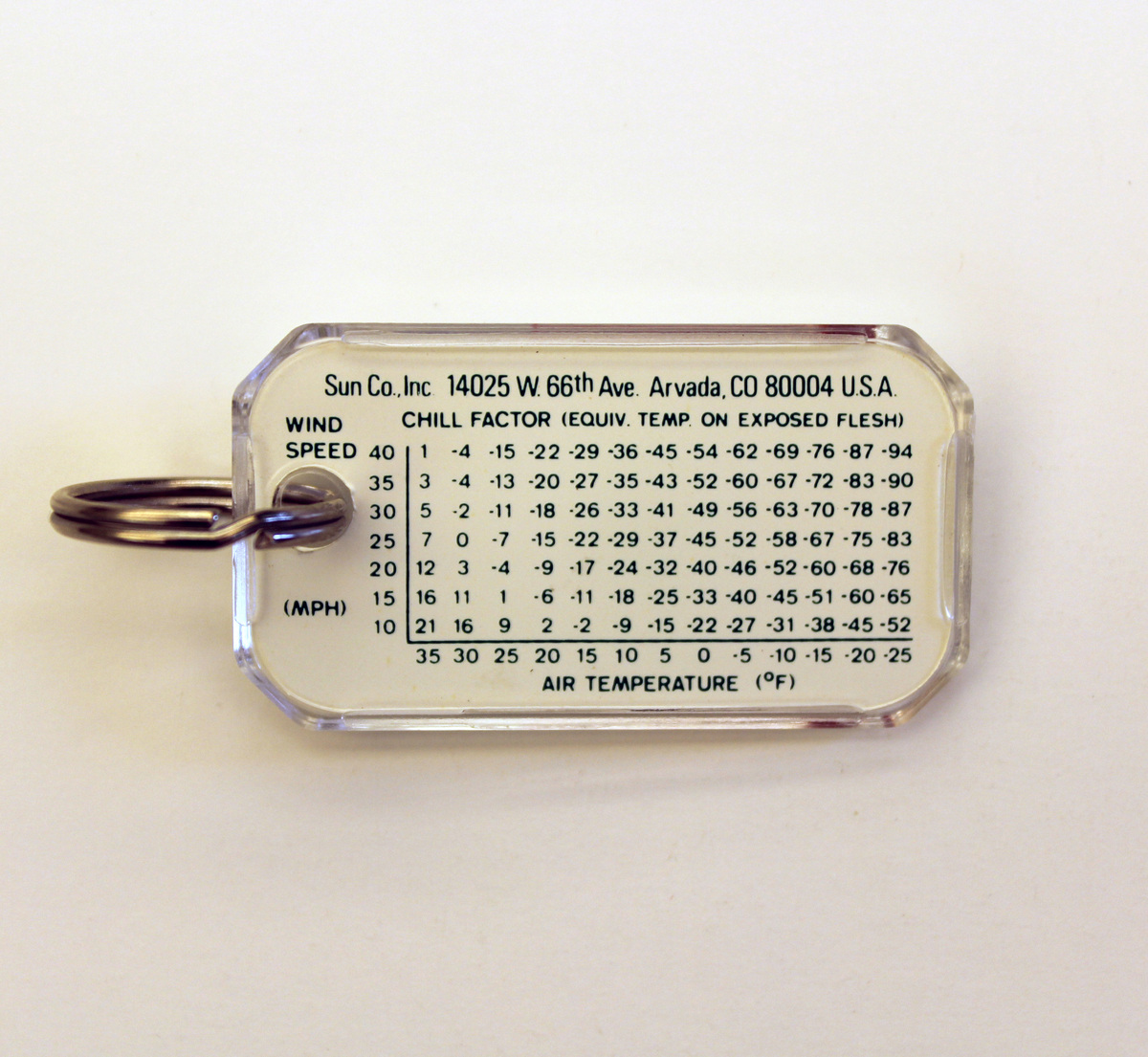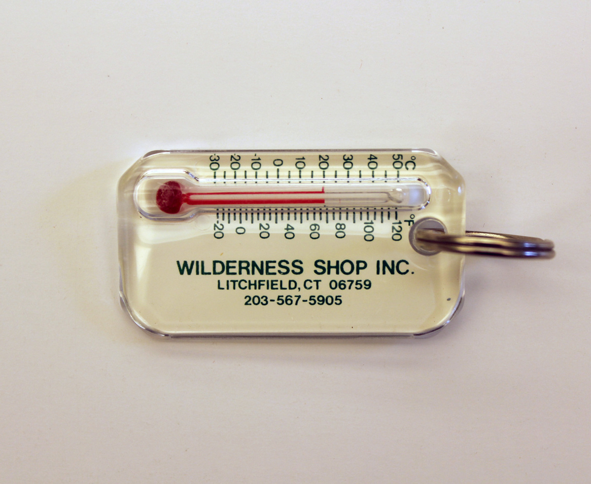 Rectangular, two-sided keychain with thermometer. Clear plastic case with printed insert. One one side, green lettering "WILDERNESS SHOP INC./LITCHFIELD, CT 06759/203-567-5905" running along thermometer with C at left (-30 to 50) and F at right (-20 to 120). On reverse of insert is manufacturer's information and a chart for calculating chill factor based on wind speed and air temperature. Silver metal key ring in loop.