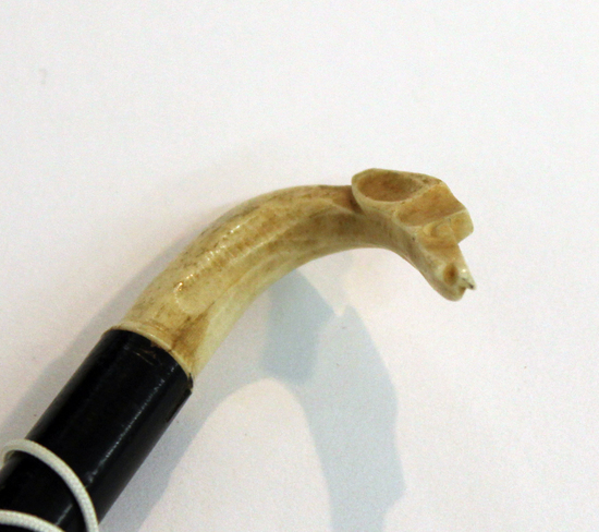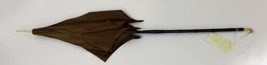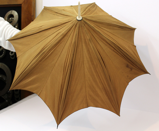 Parasol; taupe silk with metal ribs and tips; black bamboo-style handle with ivory head of a dog (possibly a greyhound); ivory end and ferrule