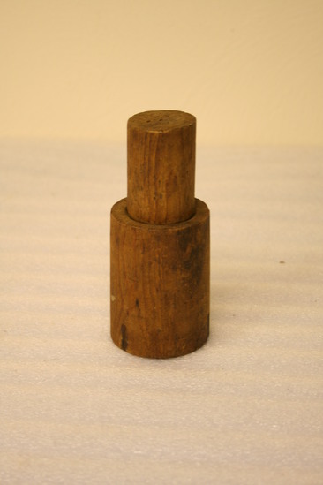 Wooden mortar and pestle. Small in size. Mortar is round piece of wood with void dug out on one end. Pestle has a circular body with one end whittled down to a point. Pointed end of pestle fits inside of void of mortar.