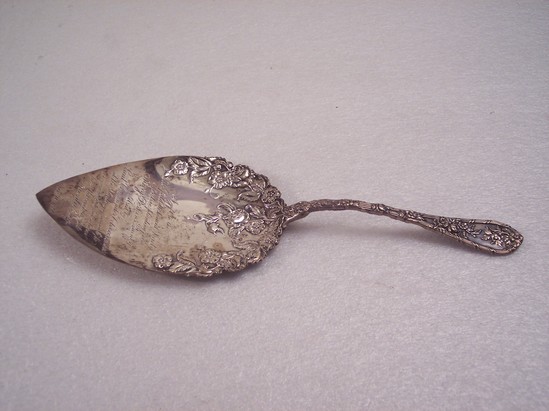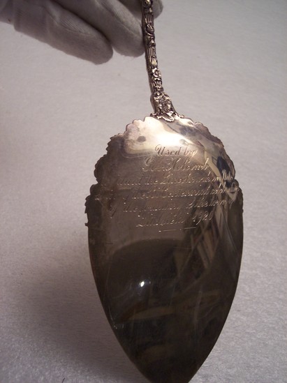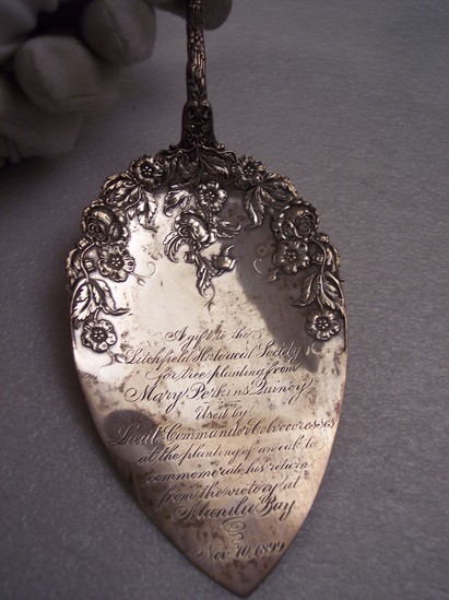 Silver trowel or cake server with heavy floral decoration on handle and upper part of flat area, used as a trowel. Inscription on face of trowel reads "A gift to the Litchfield Historical Society for Tree Planting. From Mary Perkins Quincy" On the back of the trowel inscribed "Used by Admiral GP Colvocoresses at the planting of an oak to commemorate his return from the victory of Manila Bay, Nov. 10, 1899" "Used by Gov. Holcomb to plant the Lincoln oak, on State day of the bicentennial celebration, of the founding of the Town of Litchfield, 1920"