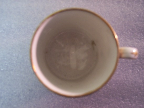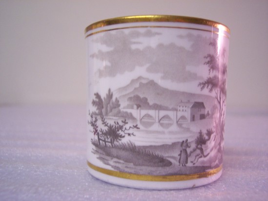 Cylinder-shaped cup with small ear-shaped handle. Gilt-banded decoration and gilt on handle. Black transfer of a river, a bridge, people, and a house on one side. LHS sticky shield affixed to one side. From the Thomas R. Trowbridge collection.