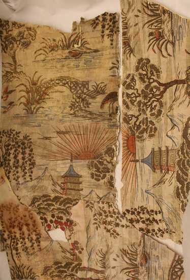 Wallpaper fragments from the dining room of the Thomas Catlin, Jr. house on East Chestnut Hill Road in Litchfield. Chinese scenic paper with cherry trees in blossom, bridge, pagoda, mallards, doves, hens, willow trees and mountains with sun setting in distance. All in browns, terra cottas, blues and reds on natural color ground with traces of silver mica. The repeat of the design is 21" high x 21" wide