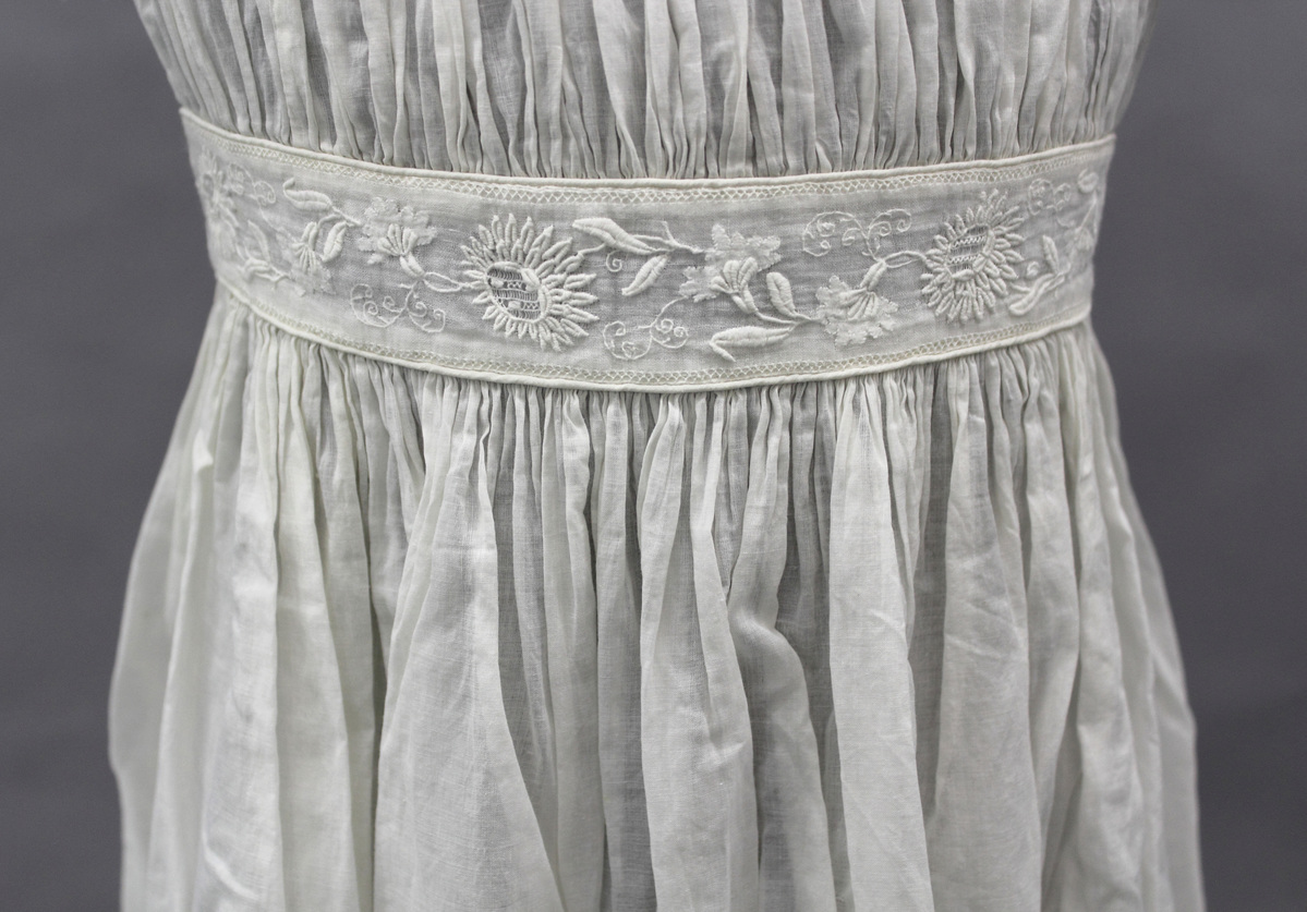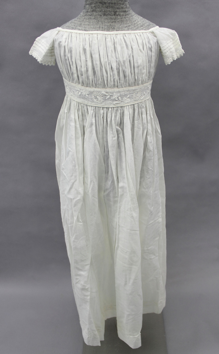 White cotton child's dress; short sleeves with tucks and embroidered edge; square neckline with binding; gathered front and back bodice; embroidered waistband with piping; skirt hem with embroidered lace insertions; center back opening with drawstring closures