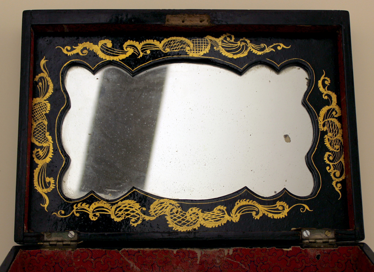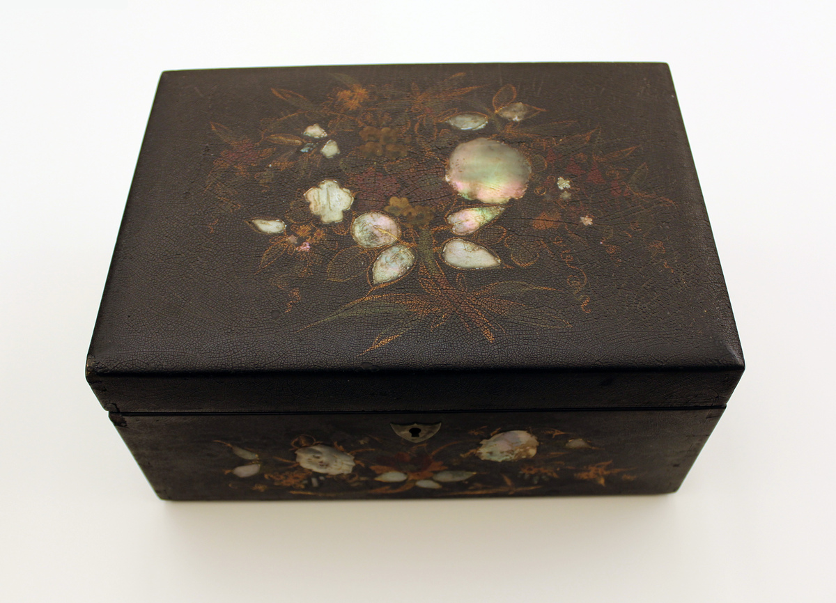 Rectangular jewelry box with hinged top lid. Wood box with dovetailed corners and black japanned exterior. Lid and front panel decorated with painted floral motifs and inlaid mother of pearl. Shield-shaped escutcheon on front panel. Interior covered with decorative paper, printed with red and blue geometric design. Inset into lid is a looking glass or mirror, held in place by a wood liner painted black and decorated with painted gilt motifs. Label pasted inside box, with handwritten text, "Beckwith."