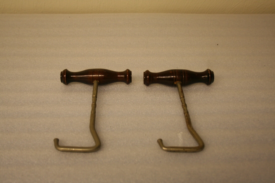 Metal rod in the shape of a 7 with wooden handle. Handle is shaped, turned, and stained a cherry color.