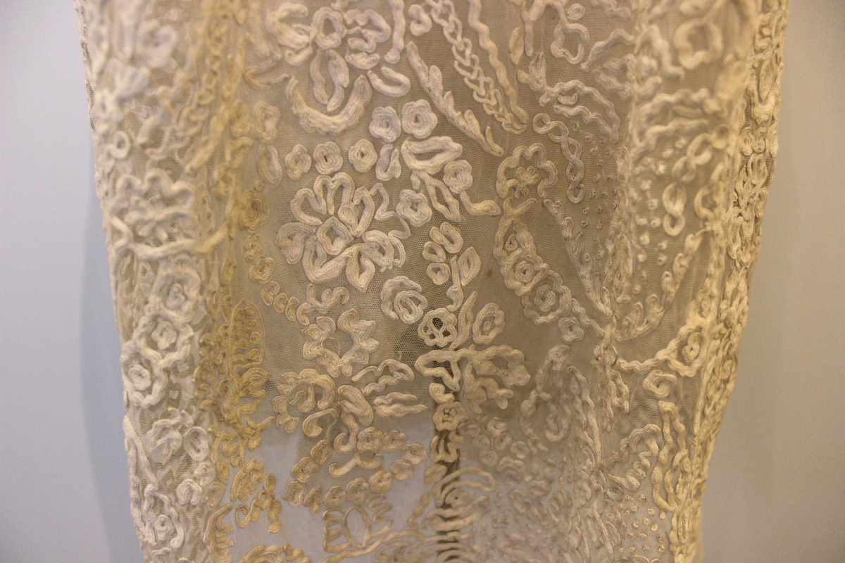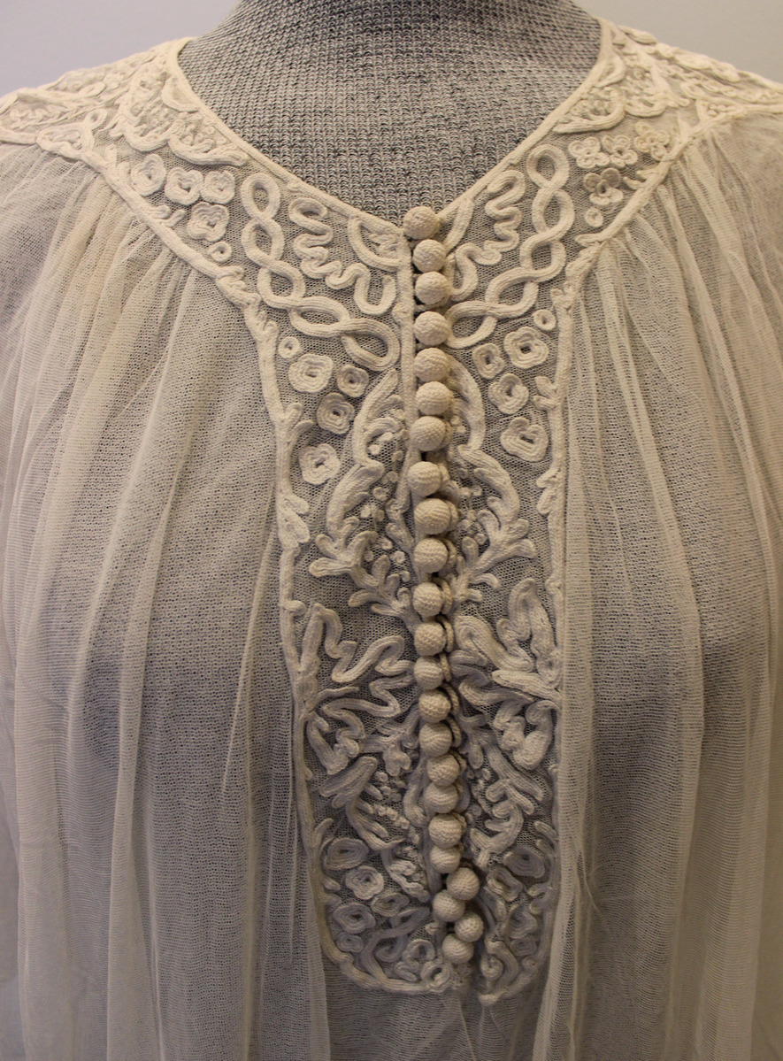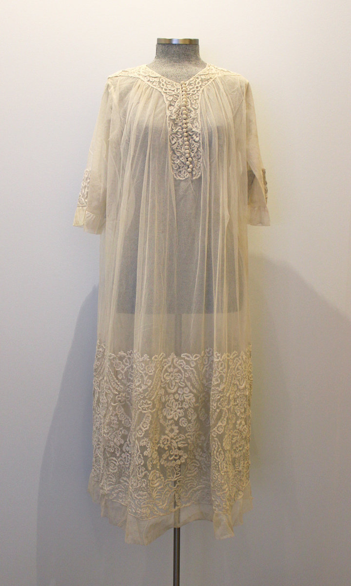 Off-white net dress, tubular shape. Three-quarter length sleeves with braid appliqué and six thread buttons. Center-front opening with braid appliqué around neck and front with 23 thread buttons and loops. Skirt border with braid appliqué. Net lining with gathers at waist sides.