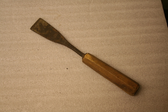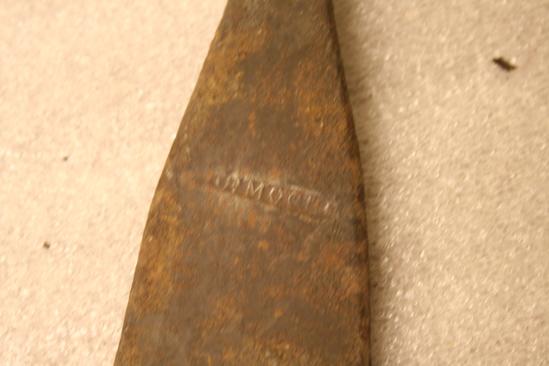 Iron blade, triangular shaped with round wooden handle. Found high in the chimney of old Baldwin house on Echo Corners. Evidently left there by workmen when the house was built.