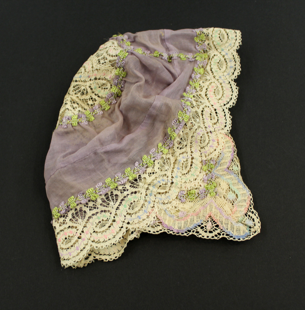 Lavender silk woman's bed cap; silk gathered around off-white lace at crown; off-white lace with pink, blue, aqua and lavender along front edge and ears; lavender and green trim along face and lace circle