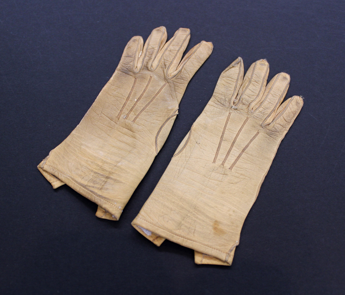Pair of tan leather child's gloves; three rows stitching on top; two buttonholes and two glass buttons for closure; printed in ink on right glove: "Le Gant / du / BON MARCHE"; printed in ink on left glove: ""4 1/3 Chevreau 195"