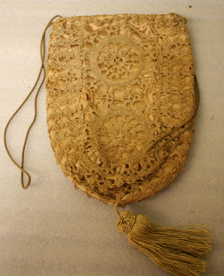 Crocheted linen purse. Semi-circular shape. No handle at top just a linen string that pulls top closed. Large crocheted tassle hanging from body of purse. Lined with white linen.