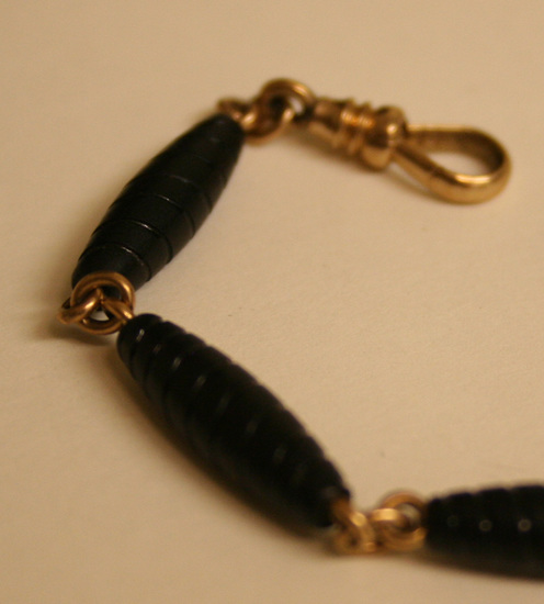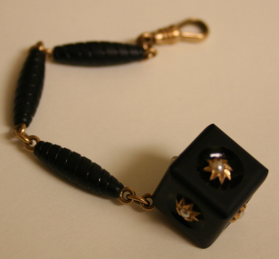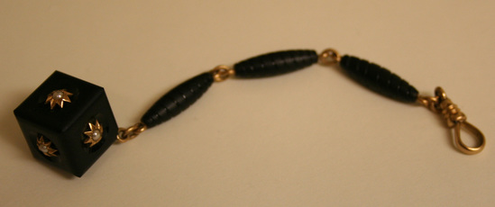 Watch fob. Three tube shaped jet links with grooves and swelled corners attached to each other by small round gold links. At one end of chain is a cube of jet with design on each face of a gold flower with pearl in center. On other end of chain is a gold watch spring looop with swivel.