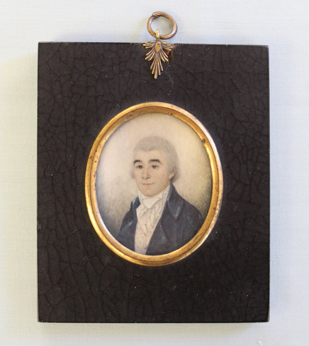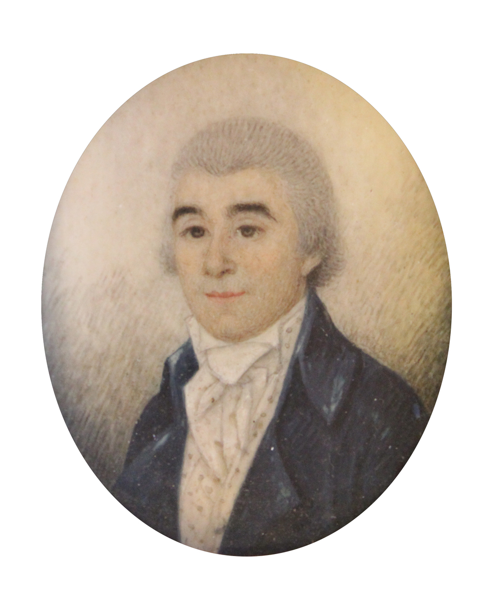 Watercolor on ivory portrait miniature of the uncle of A. D. Moore, possibly a "Doctor De Gourque," by an unknown artist, possibly Pierre Henri. Bust portrait of a man wearing a blue jacket with a spotted white vest and stock tie. The man has grey hair or is in a grey wig and has brown eyes. Facing front left against a background of white, grey, and blue. Oval portrait set in square frame of period papier mache, with gold bevel and top hanger. The portrait is under glass and is held in frame by metal tabs at back. A brown paper card on reverse reads "born 1768/died 1831/Doctor/ De Gourque [?]/uncle of A. D. Moore."