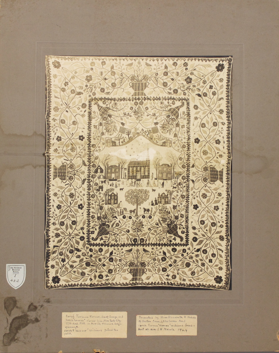 Photograph of a quilt worked by Sarah Warner Williams, pasted onto grey matboard. Rectangular, sepia toned photograph of a quilt, displayed vertically, showing a town scene. Quilt has a thick outside border of floral vines extending from four vases, with birds perched on the vines throughout. Inner panel has similar floral vines extending from four cornucopia, surrounding a town scene. Four buildings, a church, and other smaller structures are visible with numerous people and animals throughout. A small farm scene is visible above. Photograph is mounted on grey matboard with raised 15" x 12" interior border. Two adhesive labels at bottom, both with handwritten notes.