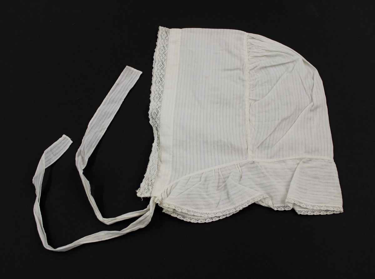 White striped cotton child's bonnet; gathered back section; piping on seam; lace along front; drawstrings at center back; neck ruffle with lace; fabric ties
