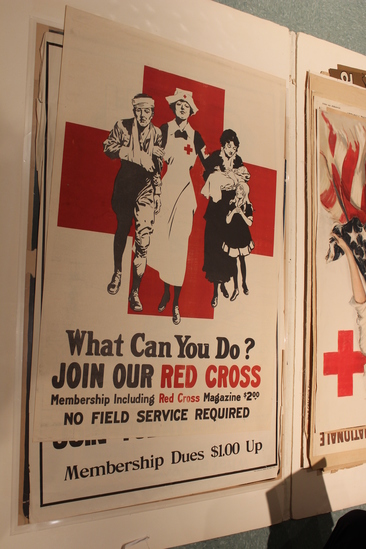World War I era poster. White poster with large red cross in background. American Red Cross nurse, wounded soldier, and mother with baby and small child in center. "What Can You Do?/ JOIN OUR RED CROSS/ Membership including Red Cross Magazine $2.00/ No Field Service Required" in red and black lettering at bottom.