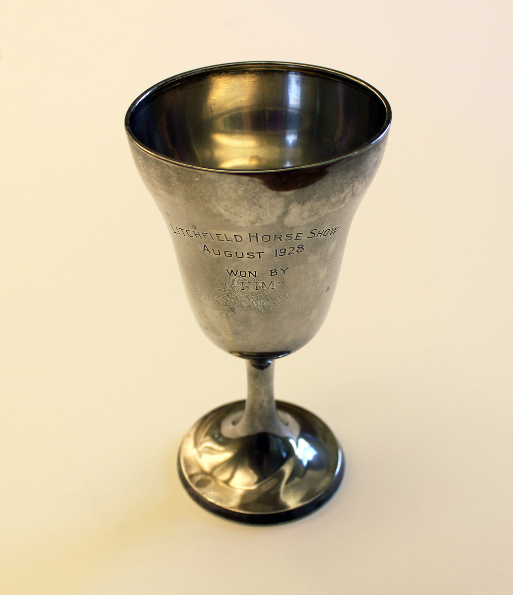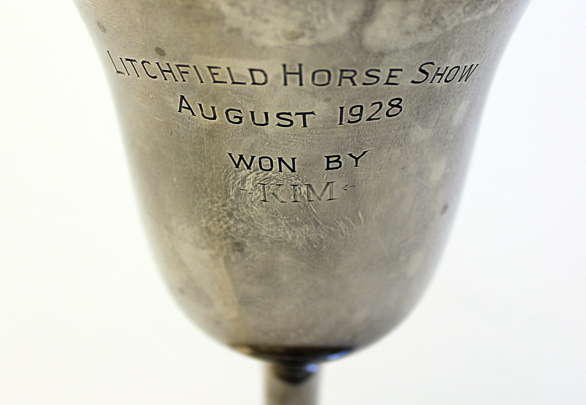 Sterling silver, goblet-style trophy awarded at the Litchfield Horse Show, Litchfield, Connecticut. Engraved on front, "LITCHFIELD HORSE SHOW/AUGUST 1928/WON BY/KIM." Maker's mark stamped on bottom of foot, "INTERNATIONAL STERLING 6 9."