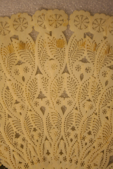 Elaborately carved ivory fan. Floral design. Silver pin at bottom.