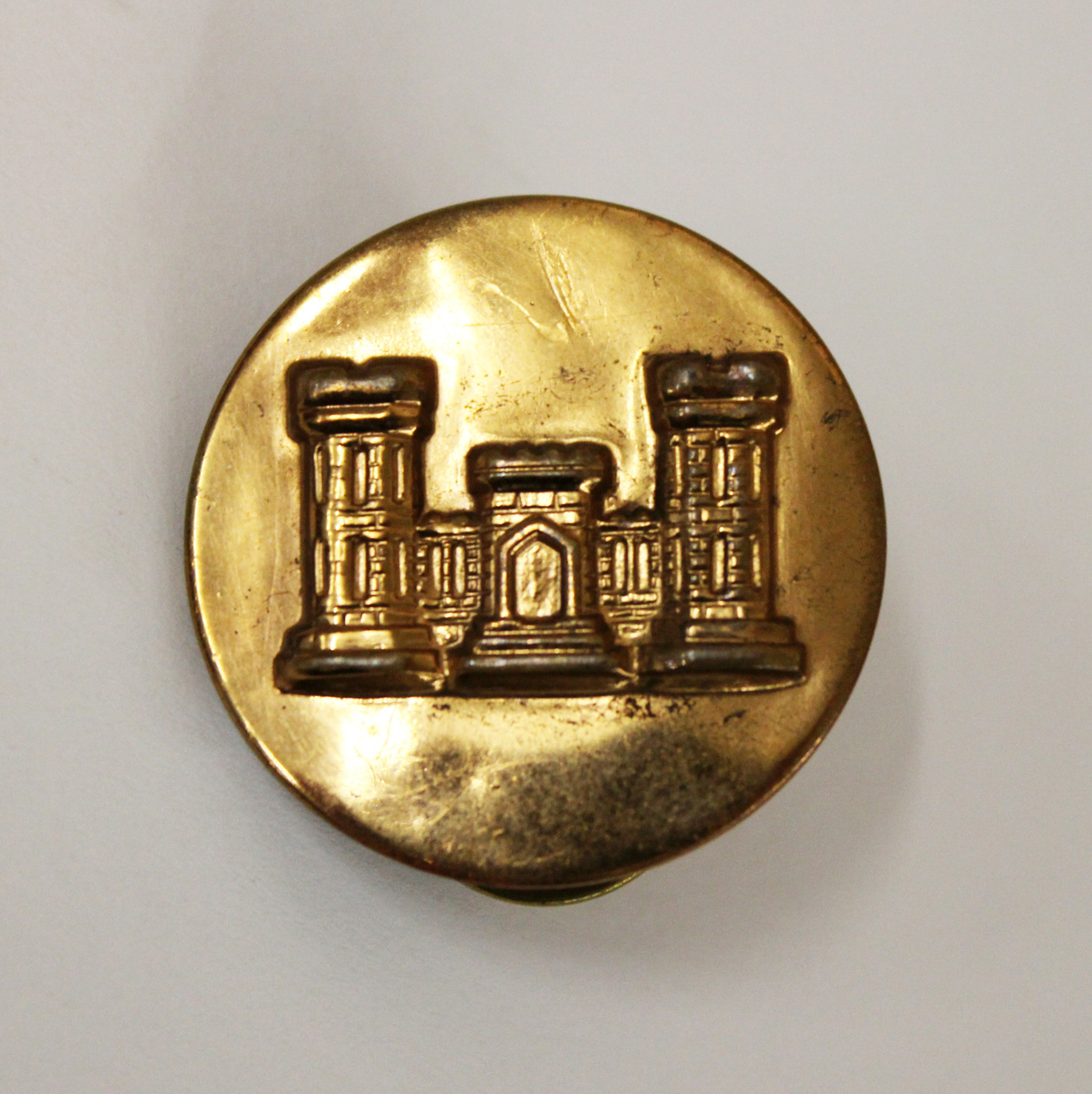 World War II era pin, U.S. Army Corps of Engineers. Circular brass pin with raised image of a castle with a central gate flanked by two towers. Two pin backs attached at reverse.