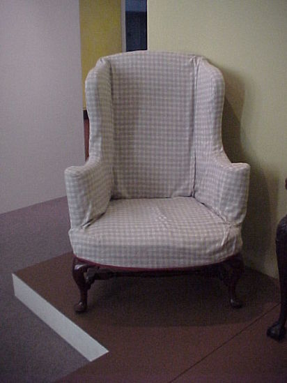 Queen Anne style wing chair. Pad feet and cabriole leg. "A" form of stretchers, turned. Low seat with cushion missing. Outward curved arms, wing back and low hump to crest. Chair has needlepoint cover which was done by donor. Chair currently covered with cotton slip cover