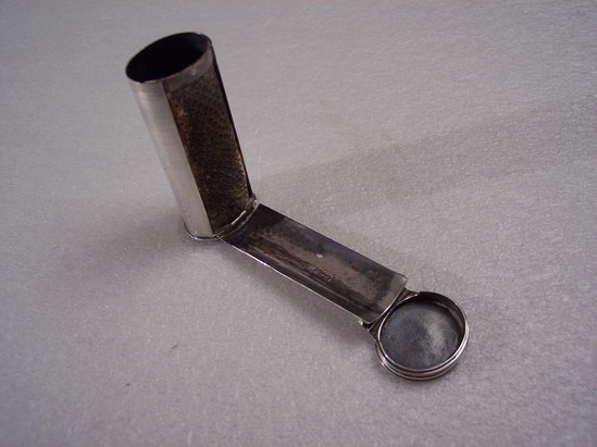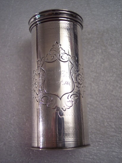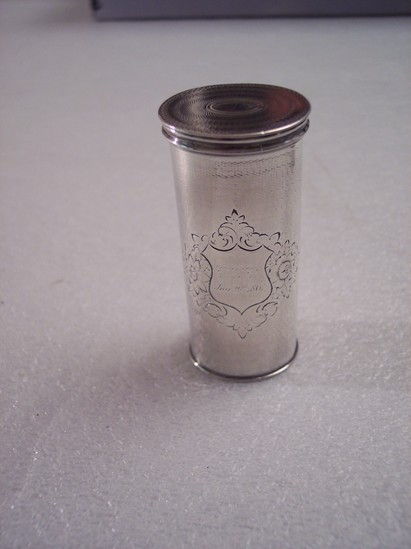 Cylindrical shape, hinged panel on top which covers grater. Small shield on front which is engraved "EFB Jan. 29th, 1861" Top and bottom of grater has etched line designs