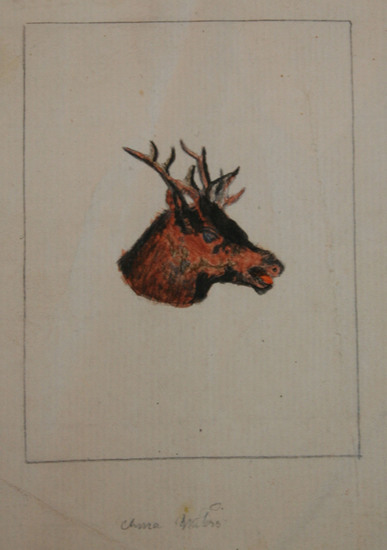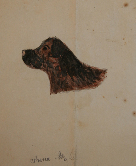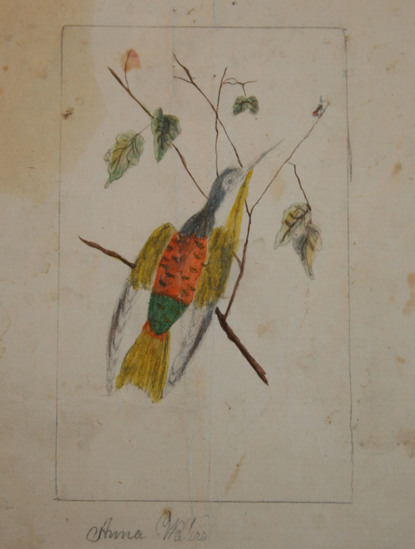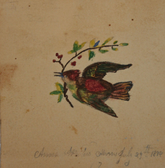 Four small watercolor on paper paintings. All are signed in pencil below, "Anna Waters." A - A bird in flight holding a branch of cherries in its beak. Bird is painting in reds, greens, and browns. Signed underneath, "Anna Waters Morris July 29 1876." B - A bird with long beak perched on a branch. Bird has an orange and green body with yellow and white wings and tail feathers. C - Head of a deer with antlers. D - Head of a brown dog, in profile.