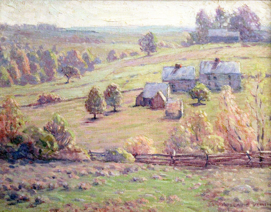Oil on canvas painting executed in a pastel palette by Adelaide Deming. Scene depicts a Litchfield County landscape view with rolling hills, trees, rocks, and buildings. A wooden fence stretches left to right across the foreground with a grouping of trees on either end of the fence. A grouping of four buildings are located on the right side, mid-field, with a clump of large trees on the left in the distance. the background shows another building surrounded by trees on the right side of the canvas just before the horizon line. "ADELAIDE DEMING" signed in black paint on lower right corner. Painting is stretched on original stretcher and has been placed in a modern gold painted wooden frame. "No 5 Afternoon in October" written in pencil on back of stretcher.