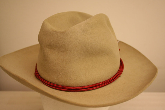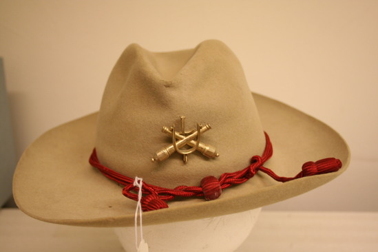 Beige felt hat; oval crown with sides slanting in and concave top; 3" wide brim turned up slightly on edge; red silk cords around base of crown with knot and covered tassels in front; gold pin in front with two cannons crossing with a "L" in center; purple silk lining and dark brown band interior; in gold on interior band "Jones Hatters El Paso Texas (with outline of state of TX and of a hat)" label also on top of lining