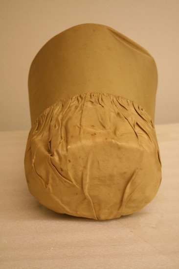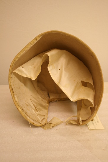 Large bonnet with cardboard base covered in yellow silk; smooth over brim, ruffled in back; white silk lining inside brim