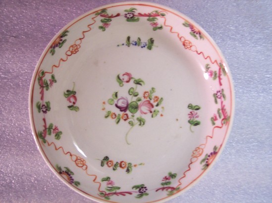 Saucer is decorated with garlands of flowers in polychrome and overglazed on the exterior. Single flower in the center.