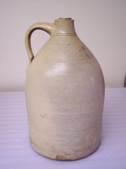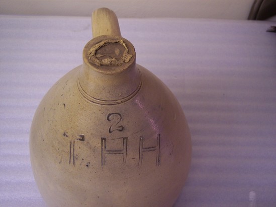 Plain base, applied handle from rim to shoulder. Cork wrapped in newsprint inserted into mouth. Double ring incised design at base of rim. Slightly uneven surface. High shoulder.