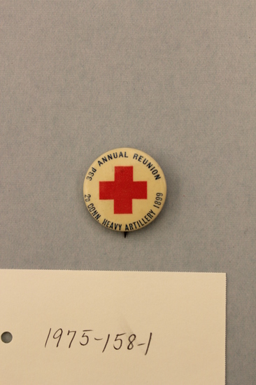 G.A.R. reunion medal. Round metal with plastic cover. White background with large red cross in center. Pin back in blue lettering around edge: "33d ANNUAL REUNION / 2D CONN. HEAVY ARTILLERY 1899."