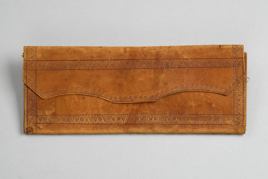 Trifold brown leather wallet. Tooled decoration inside and out with two border patterns of shells and leaf and flower repeat. Interior pockets all leather. One pocket has flap to contain paper. Stamped on inside "E.A. Lord/Maker/Litchfield/Conn" and written under flap in ink "James Lanman/Monroe/Michigan Territory"