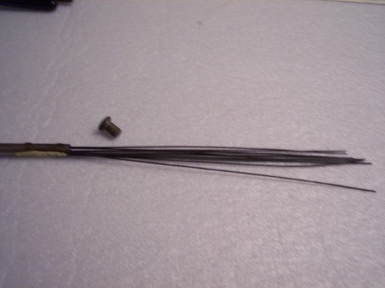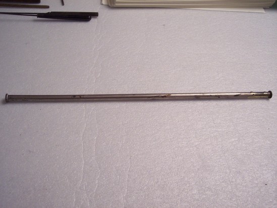Tubular metal case with screw on ends. Contains Fili form Bougies - used with catheters