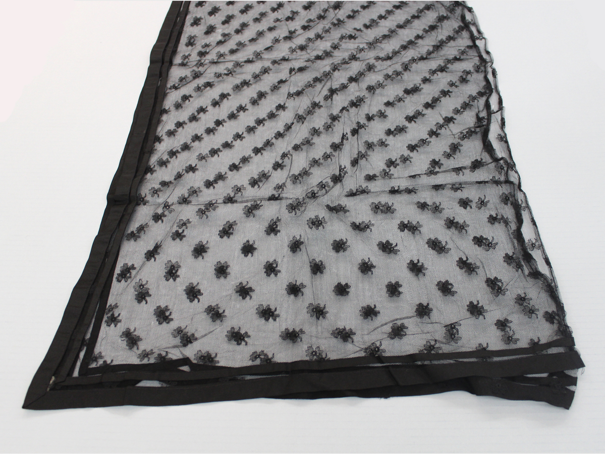 Black net lace mourning veil. Net lace with small floral motif. Two rows of striped black silk ribbon along three edges. Center seam. Machine stitched hem edge on the edge without ribbon trim.