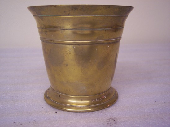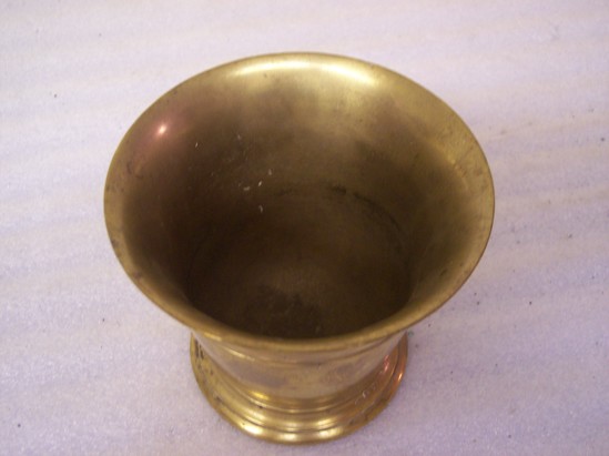 Cast piece of heavy brass with stepped base, flared sides, stepped flared bottom, incised circles on base.