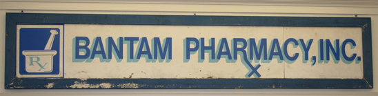 Large business sign, rectangular shape. Sign made of two pieces of wood joined together. White background. On left hand side is a blue square with a mortar and pestle painted in white with "RX" in center. "Bantam Pharmacy, Inc." in two toned blue letters. Sign framed in blue border.
