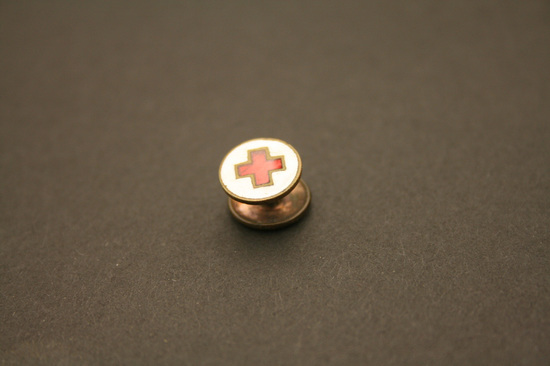 Smaller round collar button, white enamel on front with red cross in center. Brass circle on back connected by short rod, short hook on back of front to catch fabric