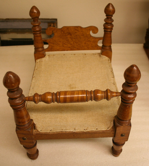 Doll's bed with hand woven linen mattress holder tacked to rails of square maple bed. Posts and head/foot boards of curly maple with turned trumpet posts with acorn like finials. Round turned foot rail. Bolster like head board with curved top an dears flat. Brass pins hold rails in place. Pencil marks on wooden pieces numbering the joints.