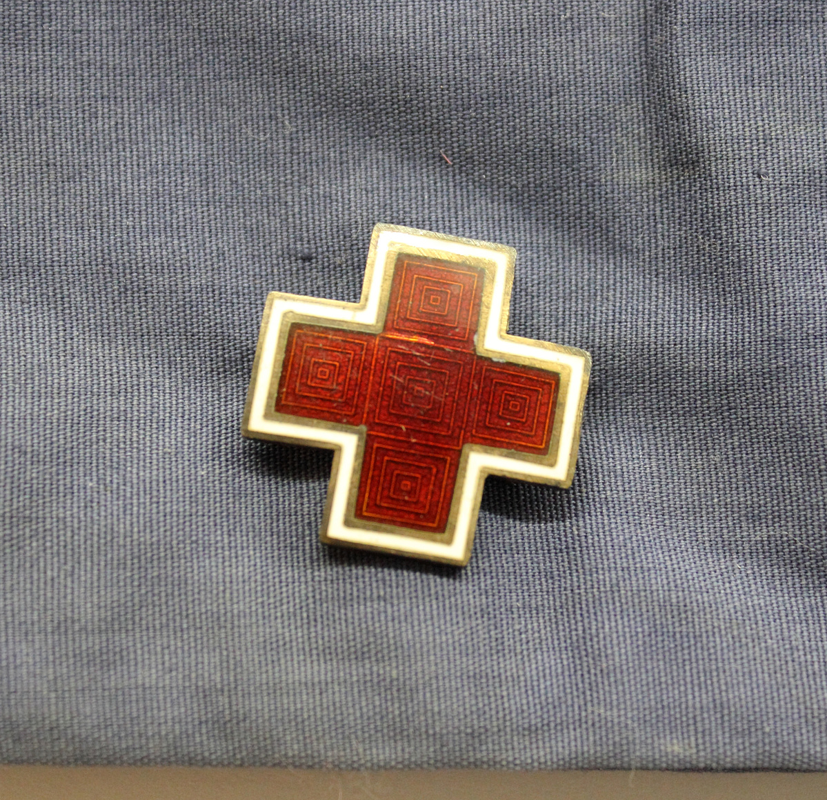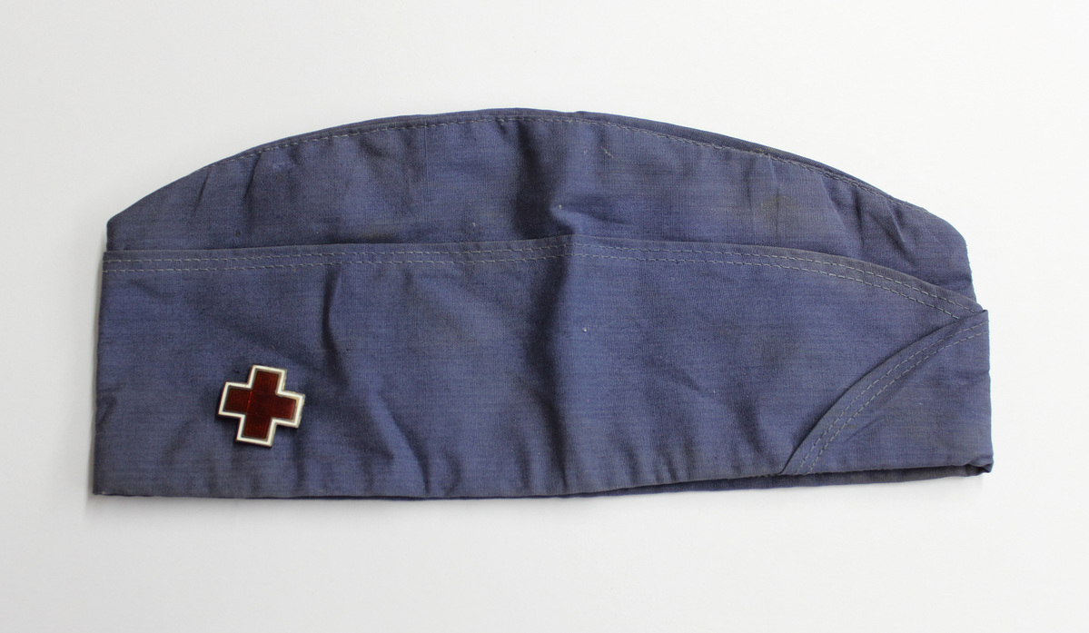 A - Medium blue cotton Red Cross Motor Corps garrison cap. Matching blue acetate lining and silk grosgrain ribbon band. White glazed paper label at center back with printing, "6 3/4/LOT/PRICE." B - Metal pin in the shape of a cross. Bronze-colored metal base with enameled front; red cross with interior geometric pattern, with gold and white border. Straight pin and clasp on reverse. Also on reverse, "Margaret G. Bissell..." printed on paper with clear adhesive tape applied on top.