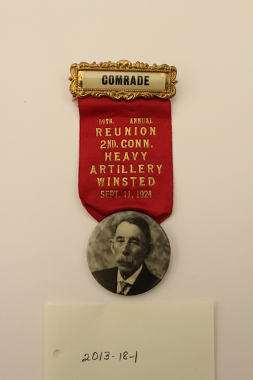 Three-piece G.A.R. reunion medal. Yellow metal bar pin at top with "COMRADE" label. Red silk ribbon with gold printing: "59TH ANNUAL / REUNION / 2ND CONN. / HEAVY / ARTILLERY / WINSTED / SEPT. 11, 1924." Ribbon gathered into a button with a black and white photograph of an elderly mustachioed man, the commander of the G.A.R. unit at the time of issue. Marks on back of ribbon and reverse of button.
