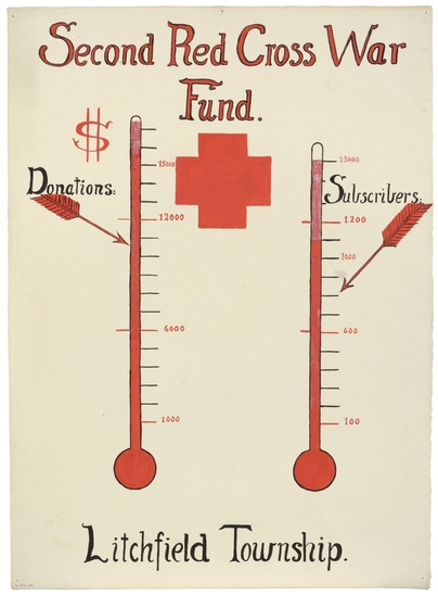 Hand painted World War I era poster. White poster with two thermometers with donation and subscriber indicators on either side. In red and black lettering, "Second Red Cross Drive/ Fund/ Entire Litchfield Territory."