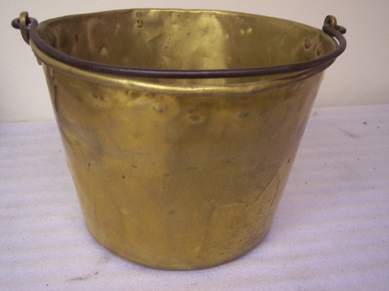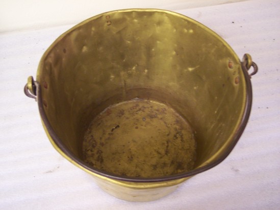 Brass pail with plain base and rolled rim. Rounded iron handle attached to brass fixtures which are held on with copper nails. Handle's ends are bent through these fixtures to hold on.