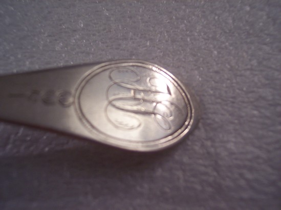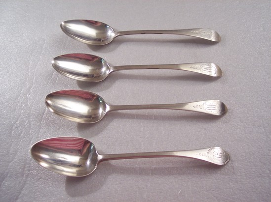 (1-3) Oval bowl, regular shaped handle, with oval end. "HS" engraved in double circle at top of handle with 3 husk swag. "BS" impressed on back of each handle (4) Broader bowl and handle end with larger circle. "HS" engraved in double circle at top of handle with 3 husk swag. "A.NORTON" in rectangle impressed on back