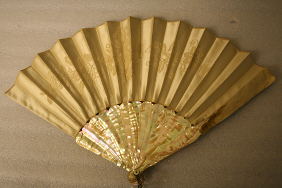 Fan with mother of pearl sticks and white silk body. Floral embroidered design on silk on one side of fan. Mother of pearl pin at base with brass handle.