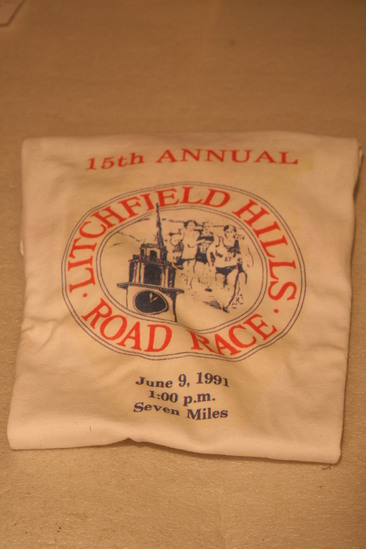 White short sleeved t-shirt. Logo on center front of shirt, printed in red and blue. Two circle logo. Inner circle had runners and steeple or clock tower. "Litchfield Hills Road Race" printed in outer circle. "15th Annual" printed above logo. New Balance logo with "New Balance" printed on left sleeve. New Balance logo with "Litchfield Bankcorp" printed on back.