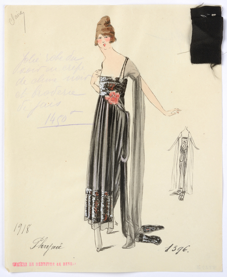 Lithograph and watercolor on paper fashion design. Evening dress in black crepe de chine with jet embroidery. Fabric samples accompany rendering.