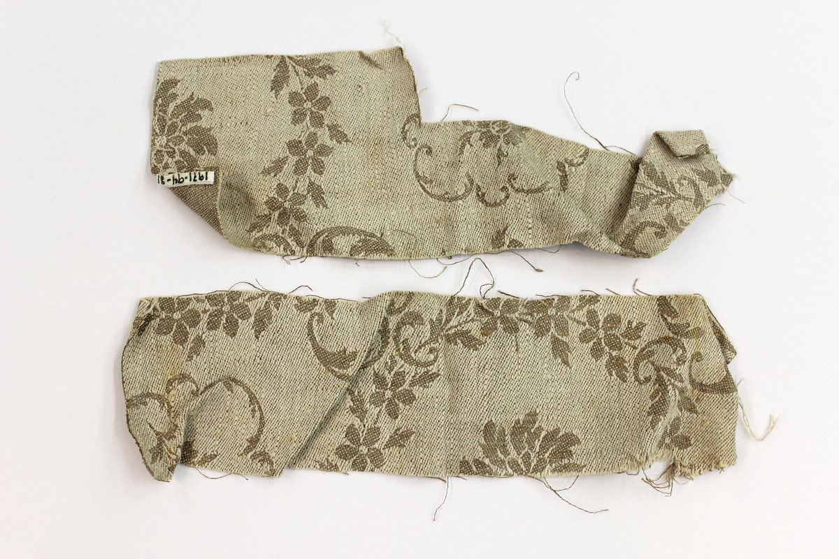 Seven textile fragments taken from floor coverings. Linen damask with scroll and floral designs, woven in bleached and unbleached natural linen. Various sizes and cuts of fabric.