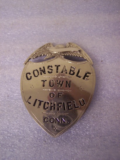 Shield shaped nickle badge with cast spread eagle on top holding on a banner in its beak. Etched into badge "CONSTABLE/TOWN/OF/LITCHFIELD/CONN"